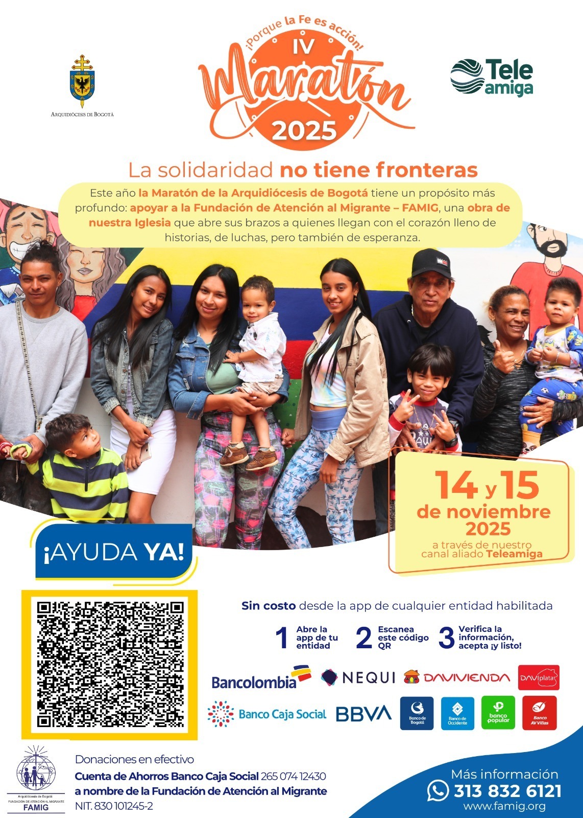 Este año, la Maratón de la Arquidiócesis de Bogotá tiene como principal objetivo apoyar a la Fundación de Atención al Migrante – FAMIG, una obra de nuestra Iglesia que abre sus brazos a quienes llegan con el corazón lleno de historias, de luchas, pero también de esperanza.