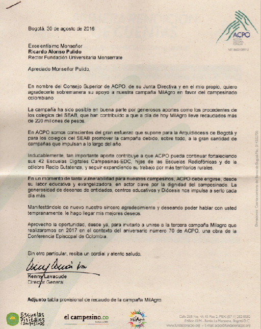 Centro de información Yo quiero Noticias Oraciones Boletines Eventos Artículos Canonización Mensajes del Señor Cardenal Cartas pastorales Homilías Mensajes La voz del pastor Documentos del Vaticano NoticiasACPO agradece apoyo fundamental de Fundación Unimonserrate en campaña MilAgro2 de Septiembre de 2016Agradecimiento de ACPO por campaña MilAgro Like 0 Dislike 0 Noticias relacionadas Ordenaciones en la Catedral Primada de Colombia Tiempo de preparación para la Navidad Video del papa - noviembre de 2025