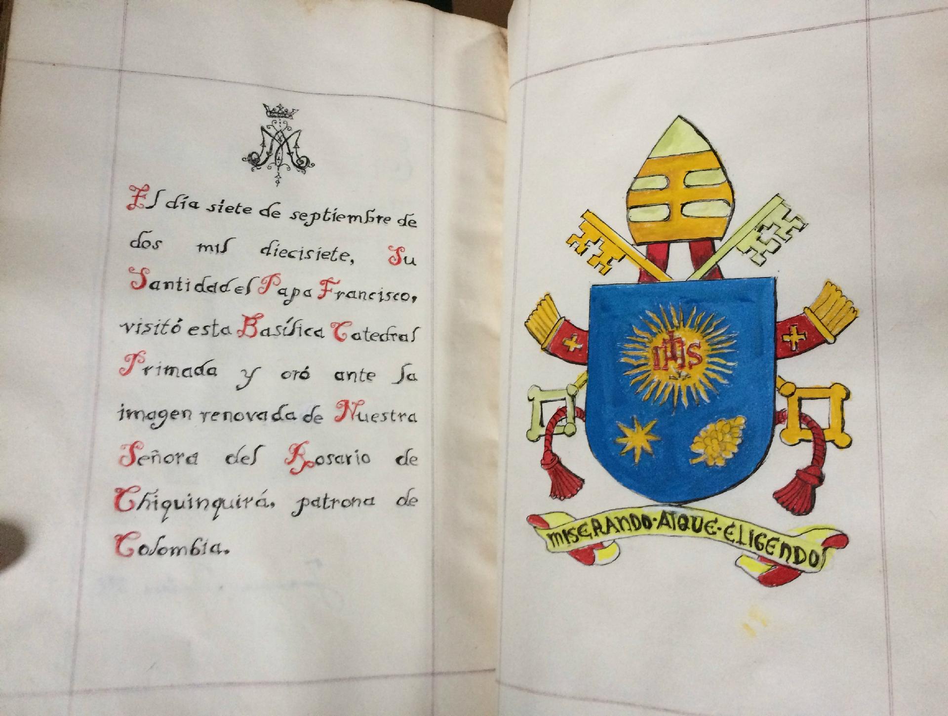El Libro Becerro, contiene los escudos y las firmas de los papas Pablo VI y Juan Pablo II, los cuales visitaron Colombia en 1968 y 1986 respectivamente. En una página de ese libro está pintado el escudo del papa Francisco y una descripción de lo que sucederá ese día. Francisco firmará con la pluma que utilizó el papa beato Pío IX cuando declaró la bula de la Inmaculada Concepción el 8 de diciembre de 1854. La pluma fue entregada por Pio IX a un cardenal, el cual la regaló a la Catedral Primada de Bogotá.