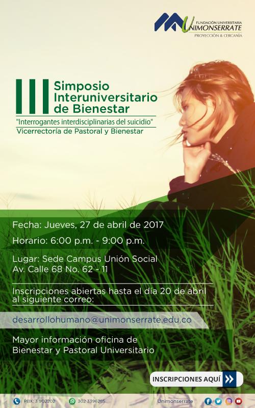 Centro de información Yo quiero Noticias Oraciones Boletines Eventos Artículos Canonización Mensajes del Señor Cardenal Cartas pastorales Homilías Mensajes La voz del pastor Documentos del Vaticano NoticiasIII Simposio Interuniversitario de Bienestar "Interrogantes interdisciplinarias de suicidio"18 de Abril de 2017Inscripciones abiertas hasta el 20 de abril, mayor información oficina de Bienestar y Pastoral Universitario Like 0 Dislike 0 Noticias relacionadas Ordenaciones en la Catedral Primada de Colombia Tiempo de preparación para la Navidad Video del papa - noviembre de 2025