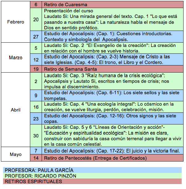 En diez sesiones presenciales, magistrales del estudio del texto bíblico y talleres de aplicación hacia una conversión ecológica, los participantes profundizarán paso a paso todo el Libro del Apocalipsis desde la lectura y el estudio correspondiente de la Encíclica Laudato Si y de la traducción del Nuevo Testamento de la Biblia de la Iglesia en América BIA del CELAM.