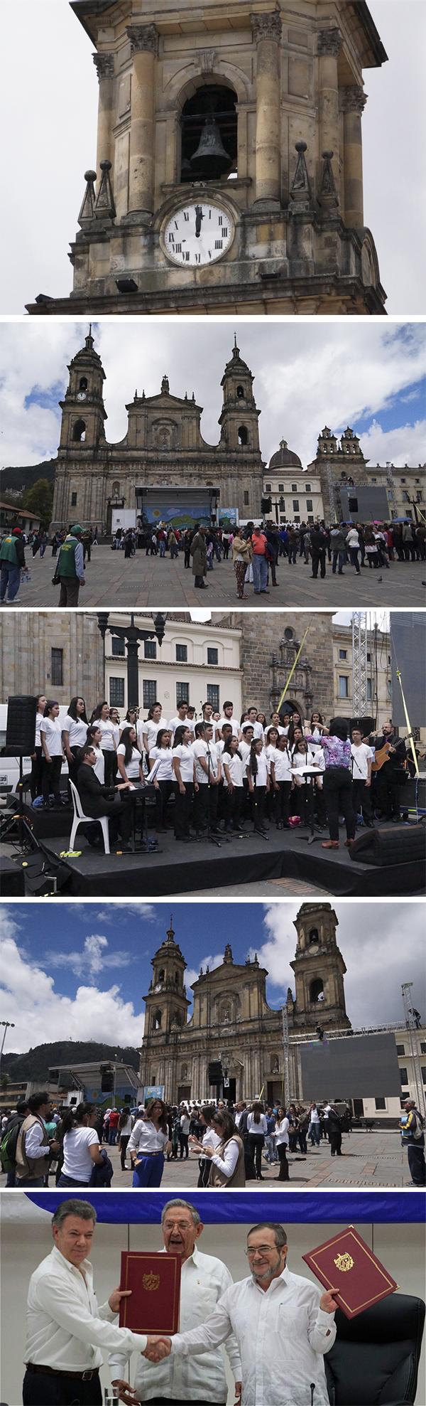 La plaza de Bolívar en el centro de la capital de Colombia se vistió de fiesta; un sol radiante de medio día ,reporteros, medios de comunicación, grupos musicales, transeúntes, vendedores ambulantes y por supuesto las frecuentes palomas llenaron la plaza, mientras el sonido de las campanas anunciaban un hecho sin precedentes, un logro esperado desde hace 50 años, la tan anhelada paz para Colombia.
