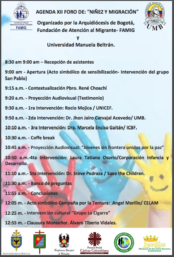 En coordinación con la arquidiócesis de Bogotá, la Fundación de Atención al Migrante, las vicarías territoriales, la corporación Scalabrini y la Universidad Manuela Beltrán han organizado el foro “Niñez y Migración”, que contará con la participación de panelistas de entidades públicas y privadas como: ICBF, Corporación Infancia y Desarrollo, Save the Children, Unicef, Universidad Manuela Beltrán.