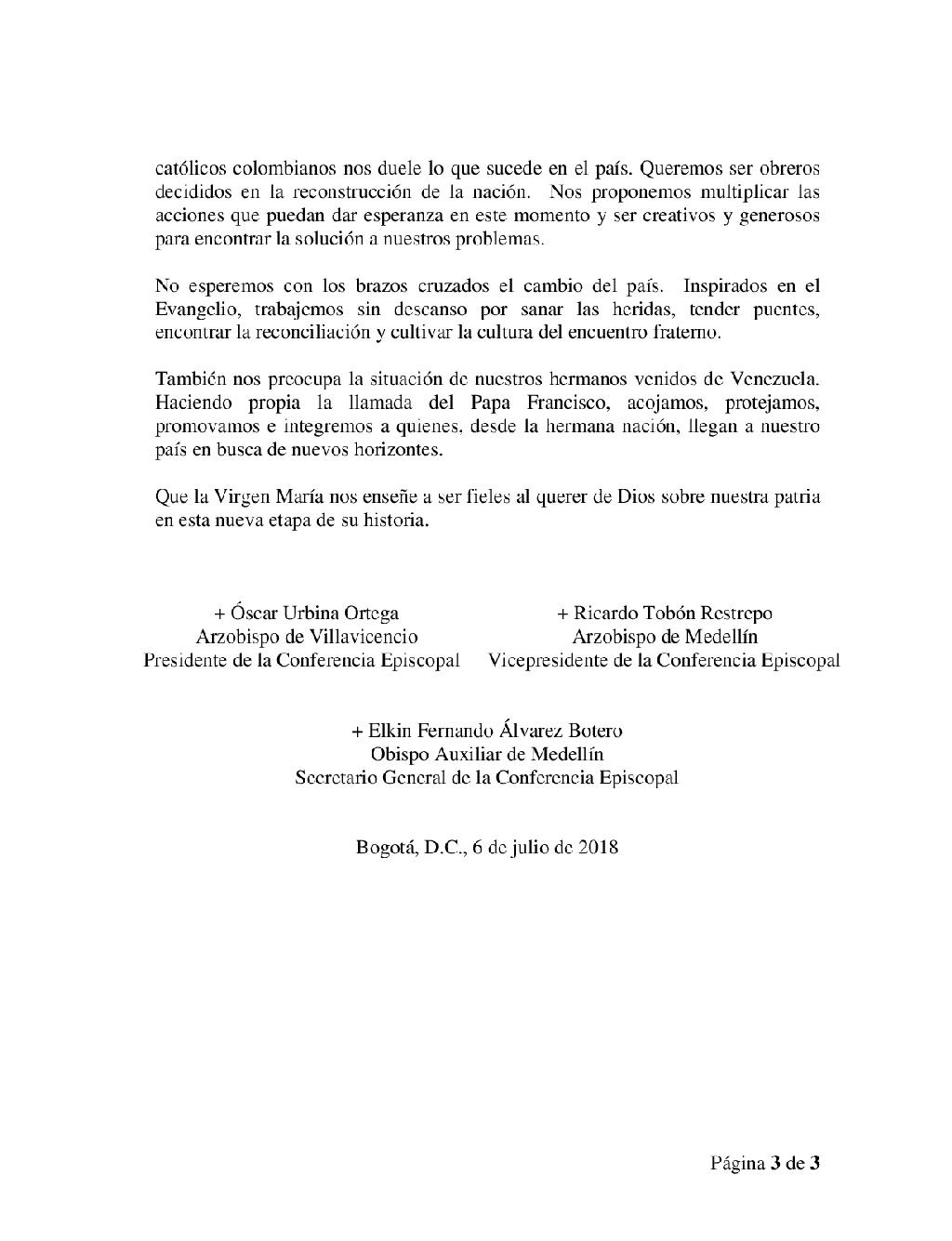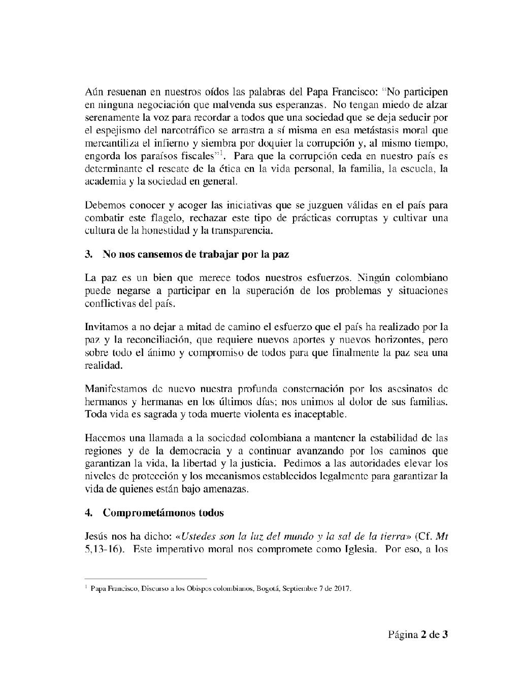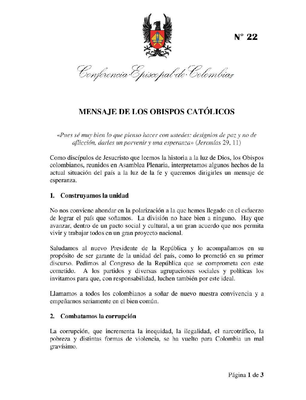 Centro de información Yo quiero Noticias Boletines Eventos Artículos Canonización Mensajes del Señor Cardenal Cartas pastorales Homilías Mensajes La voz del pastor Documentos del Vaticano NoticiasObispos invitan a construir unidad, combatir la corrupción y trabajar por la paz6 de Julio de 2018Tras concluir la CVI Asamblea Plenaria del Episcopado Colombiano, a través de un mensaje, los obispos del país invitaron a las nuevas autoridades y a todos los… Like 0 Dislike 0 Noticias relacionadas Ordenaciones en la Catedral Primada de Colombia Tiempo de preparación para la Navidad Video del papa - noviembre de 2025