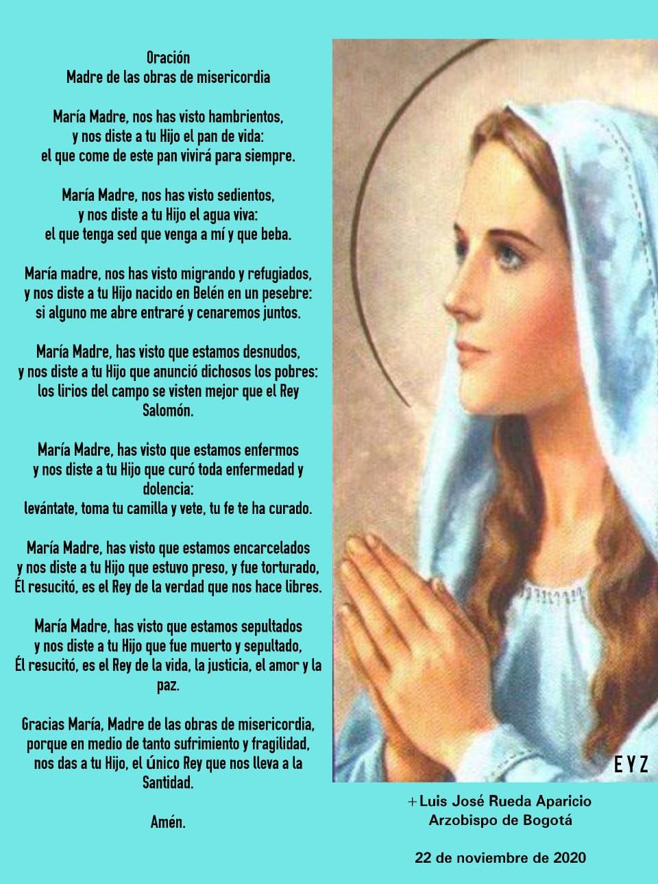 Centro de información Yo quiero Noticias Boletines Eventos Artículos Canonización Mensajes del Señor Cardenal Cartas pastorales Homilías Mensajes La voz del pastor Documentos del Vaticano NoticiasOración: Madre de las obras de misericordia24 de Noviembre de 2020Madre de las obras de misericordia Like 0 Dislike 0 Noticias relacionadas Ordenaciones en la Catedral Primada de Colombia Tiempo de preparación para la Navidad Video del papa - noviembre de 2025