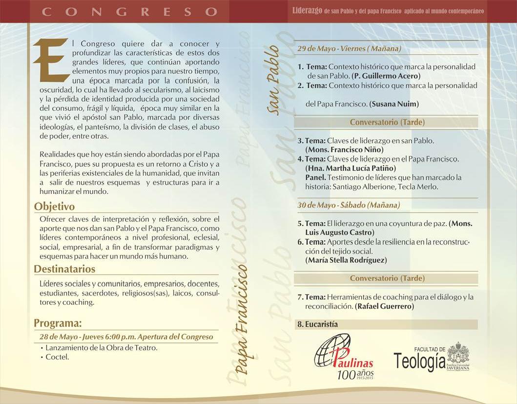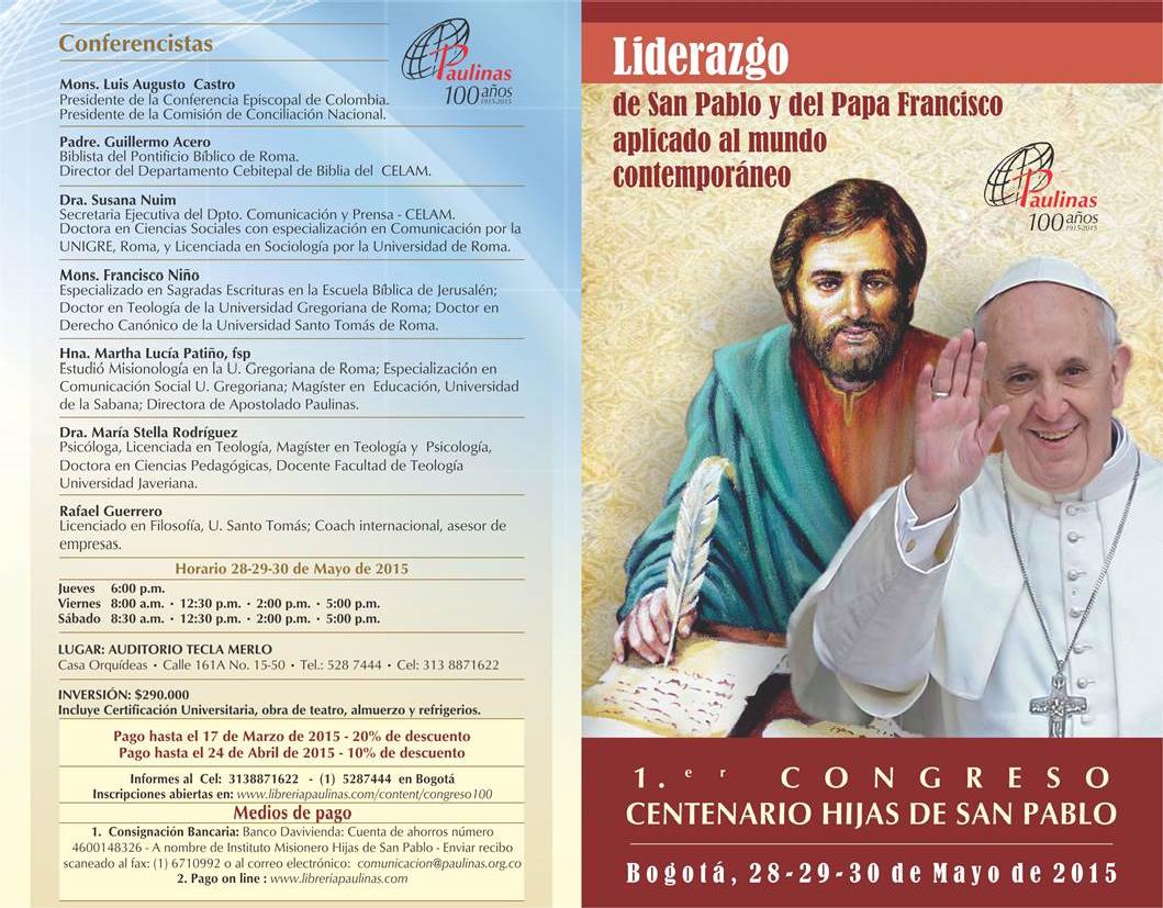 Centro de información Yo quiero Noticias Boletines Eventos Artículos Canonización Mensajes del Señor Cardenal Cartas pastorales Homilías Mensajes La voz del pastor Documentos del Vaticano NoticiasPrimer Congreso: Liderazgo de San Pablo y del Papa Francisco aplicado al mundo contemporaneo27 de Mayo de 2015Para mayor información haz clink en el siguiente link: http://libreriapaulinas.com/congreso Like 0 Dislike 0 Noticias relacionadas Ordenaciones en la Catedral Primada de Colombia Tiempo de preparación para la Navidad Video del papa - noviembre de 2025