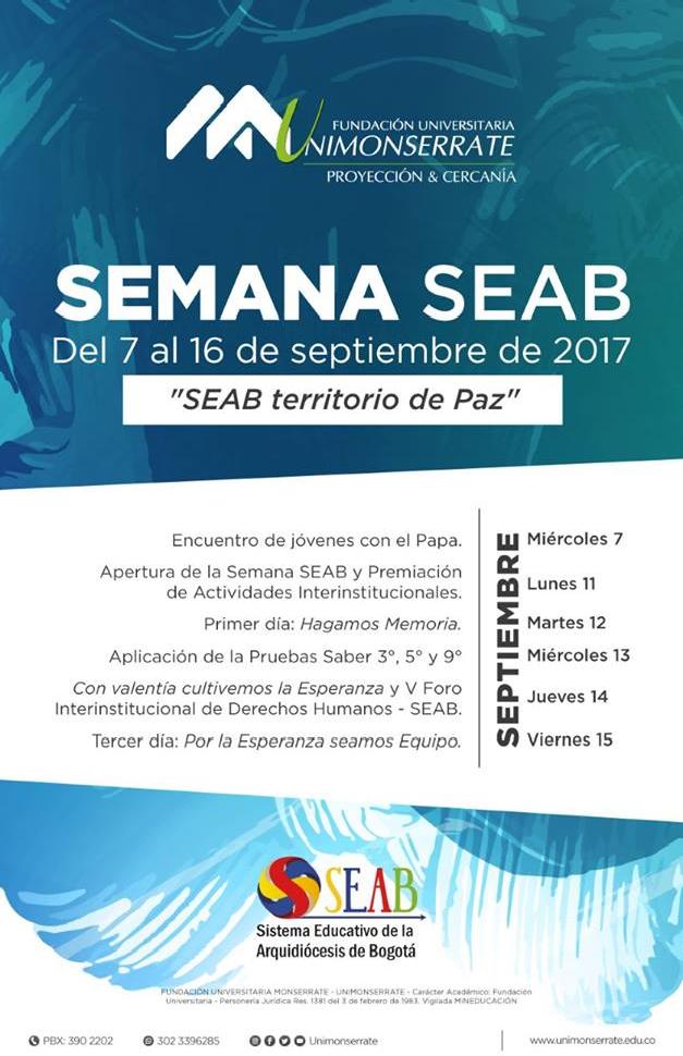 Centro de información Yo quiero Noticias Boletines Eventos Artículos Canonización Mensajes del Señor Cardenal Cartas pastorales Homilías Mensajes La voz del pastor Documentos del Vaticano NoticiasProgramación de la semana del SEAB 201712 de Septiembre de 2017Del 7 al 16 de septiembre de 2017 se realizará en los colegios del sistema educativo arquidiocesano, la semana del SEAB, teniendo como temática principal “SEAB un… Like 0 Dislike 0 Noticias relacionadas Ordenaciones en la Catedral Primada de Colombia Tiempo de preparación para la Navidad Video del papa - noviembre de 2025
