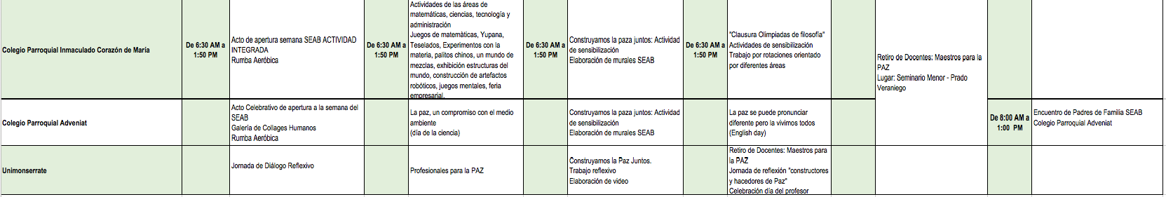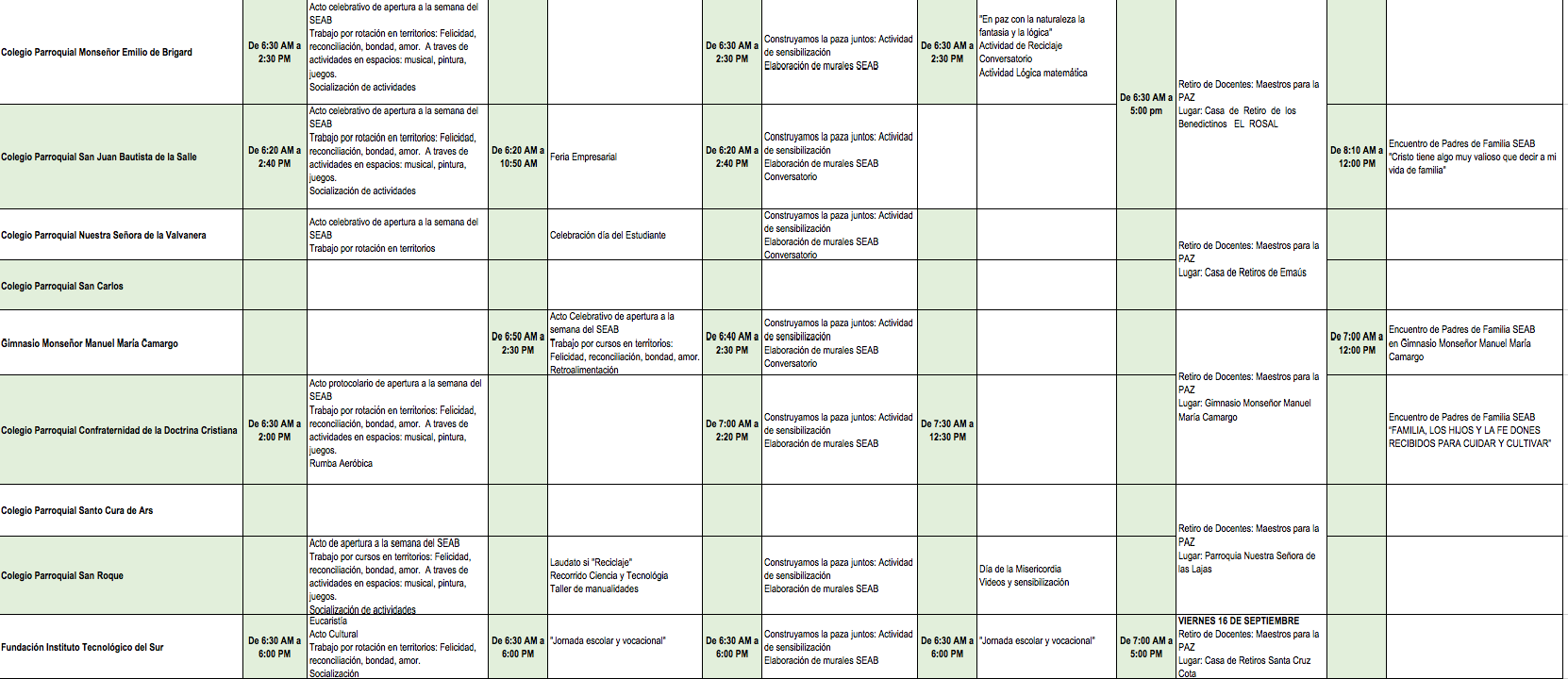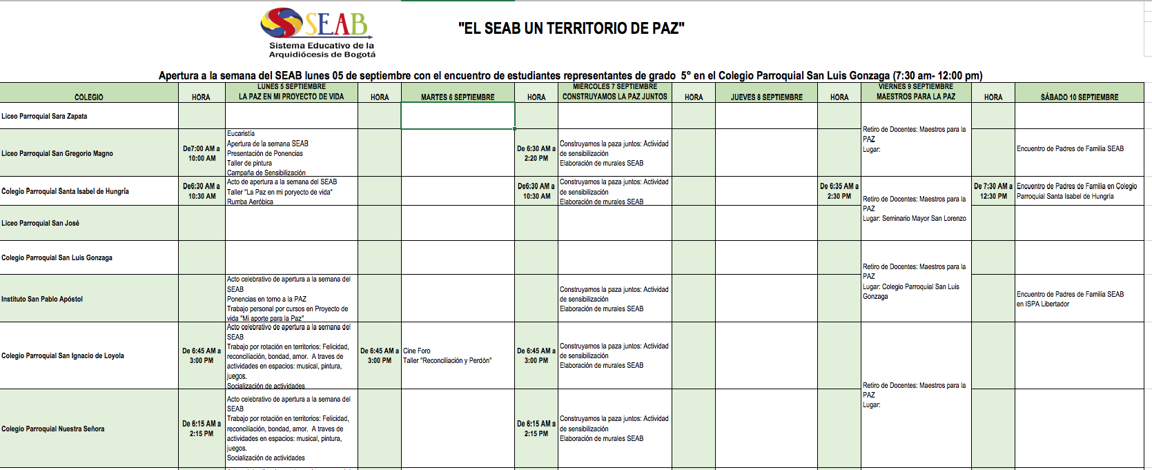 Centro de información Yo quiero Noticias Oraciones Boletines Eventos Artículos Canonización Mensajes del Señor Cardenal Cartas pastorales Homilías Mensajes La voz del pastor Documentos del Vaticano NoticiasProgramaciónEl SEAB un territorio de Paz5 de Septiembre de 2016Descargue la programación a continuación:Programación semana del SEABDescargar Like 0 Dislike 0 Noticias relacionadas Ordenaciones en la Catedral Primada de Colombia Tiempo de preparación para la Navidad Video del papa - noviembre de 2025