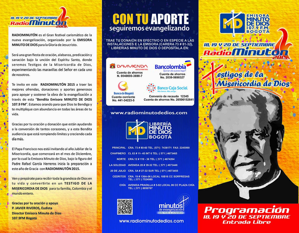 El padre Diego Jaramillo, presidente de la Organización Minuto de Dios; su vicepresidente, el padre Alberto José Linero Gómez; y el padre Javier Riveros, director de la emisora y todo un equipo de colaboradores del Centro Carismático del Minuto de Dios, extienden la invitación a los medios de comunicación, entidades públicas, privadas y a la comunidad en general para que sean partícipes del Radiominutón 2015 “Testigos de la Misericordia de Dios”.