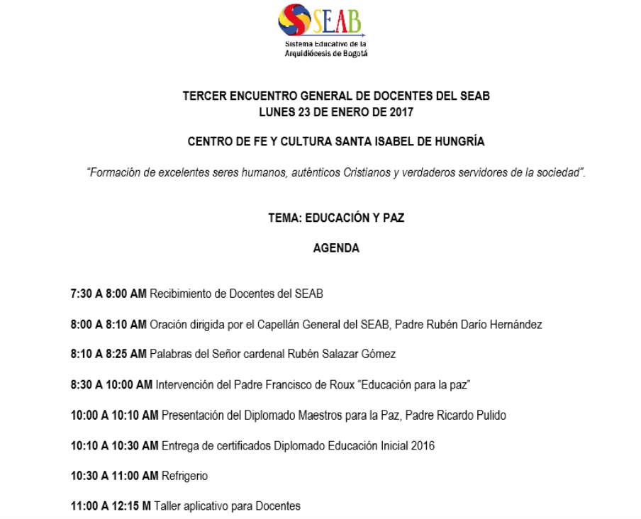 Centro de información Yo quiero Noticias Oraciones Boletines Eventos Artículos Canonización Mensajes del Señor Cardenal Cartas pastorales Homilías Mensajes La voz del pastor Documentos del Vaticano NoticiasTercer encuentro general de docentes SEAB20 de Enero de 2017 Like 0 Dislike 0 Noticias relacionadas Ordenaciones en la Catedral Primada de Colombia Tiempo de preparación para la Navidad Video del papa - noviembre de 2025